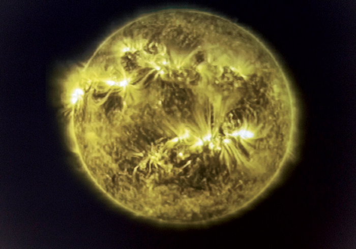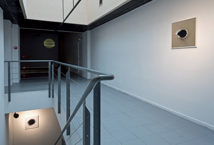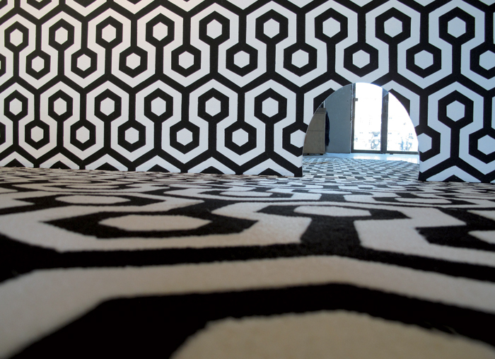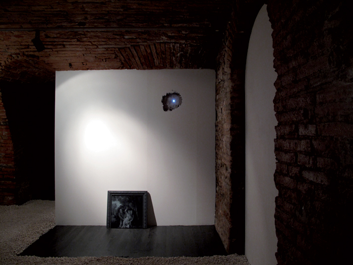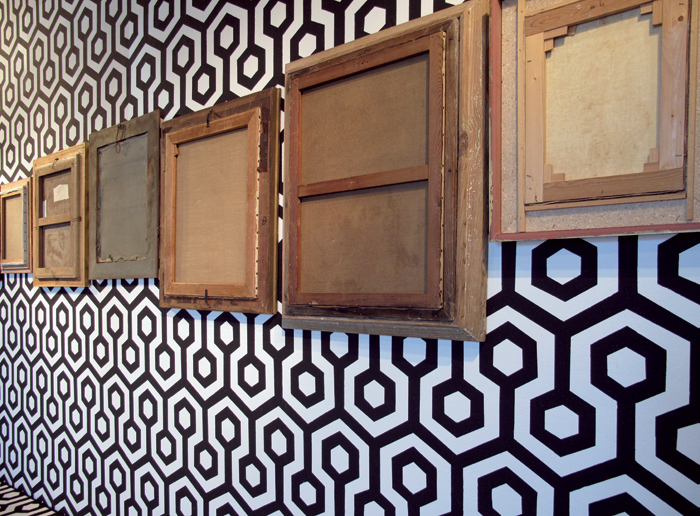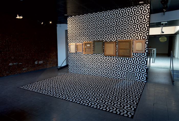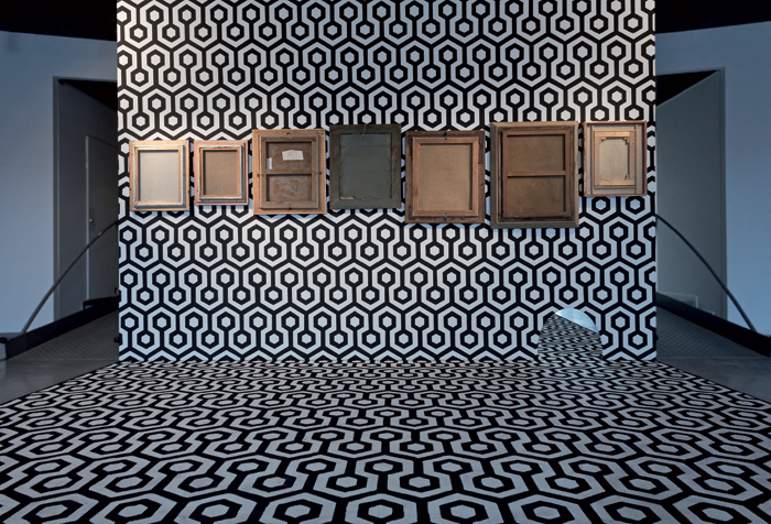 Impression numérique sur papier intissé, porte va-et-vient en bois et métal, bottes de paille vidéo projection en boucle (durée 53’)