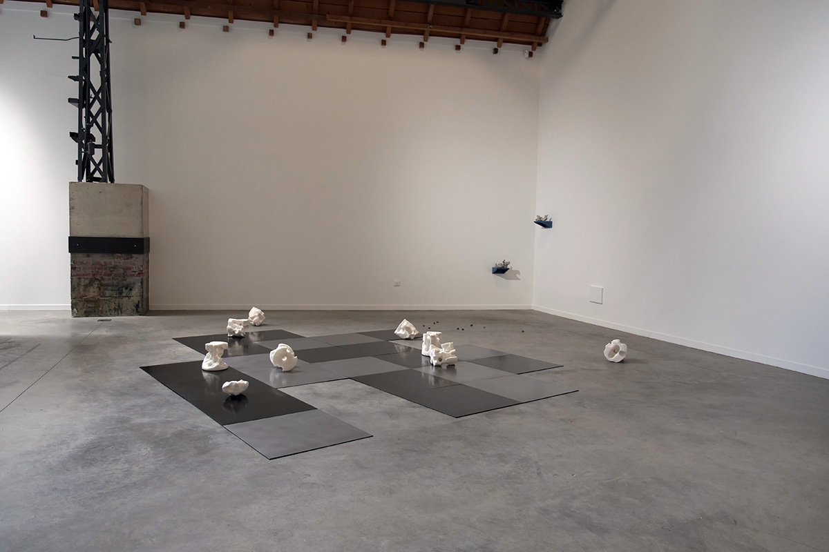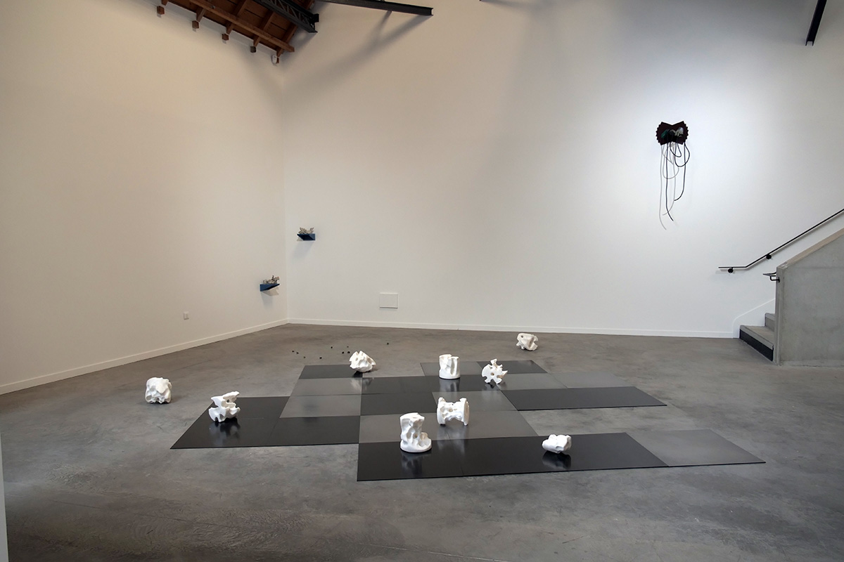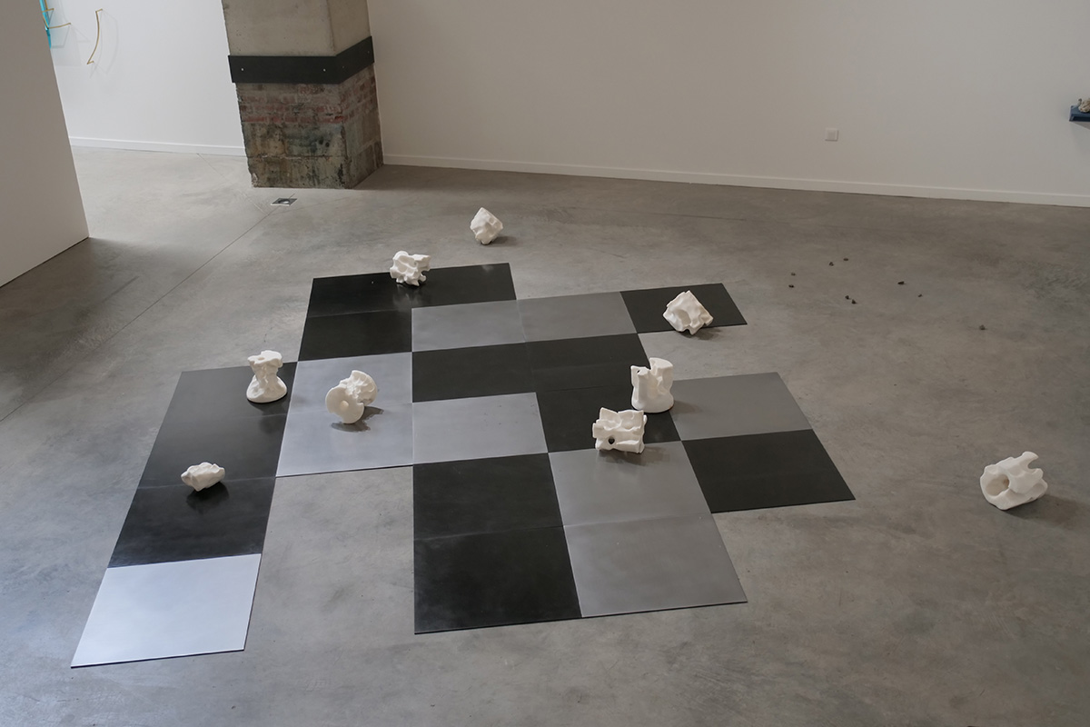 Sculptures aléatoires, litière pour chat, résine, MDF teinté dans la masse.