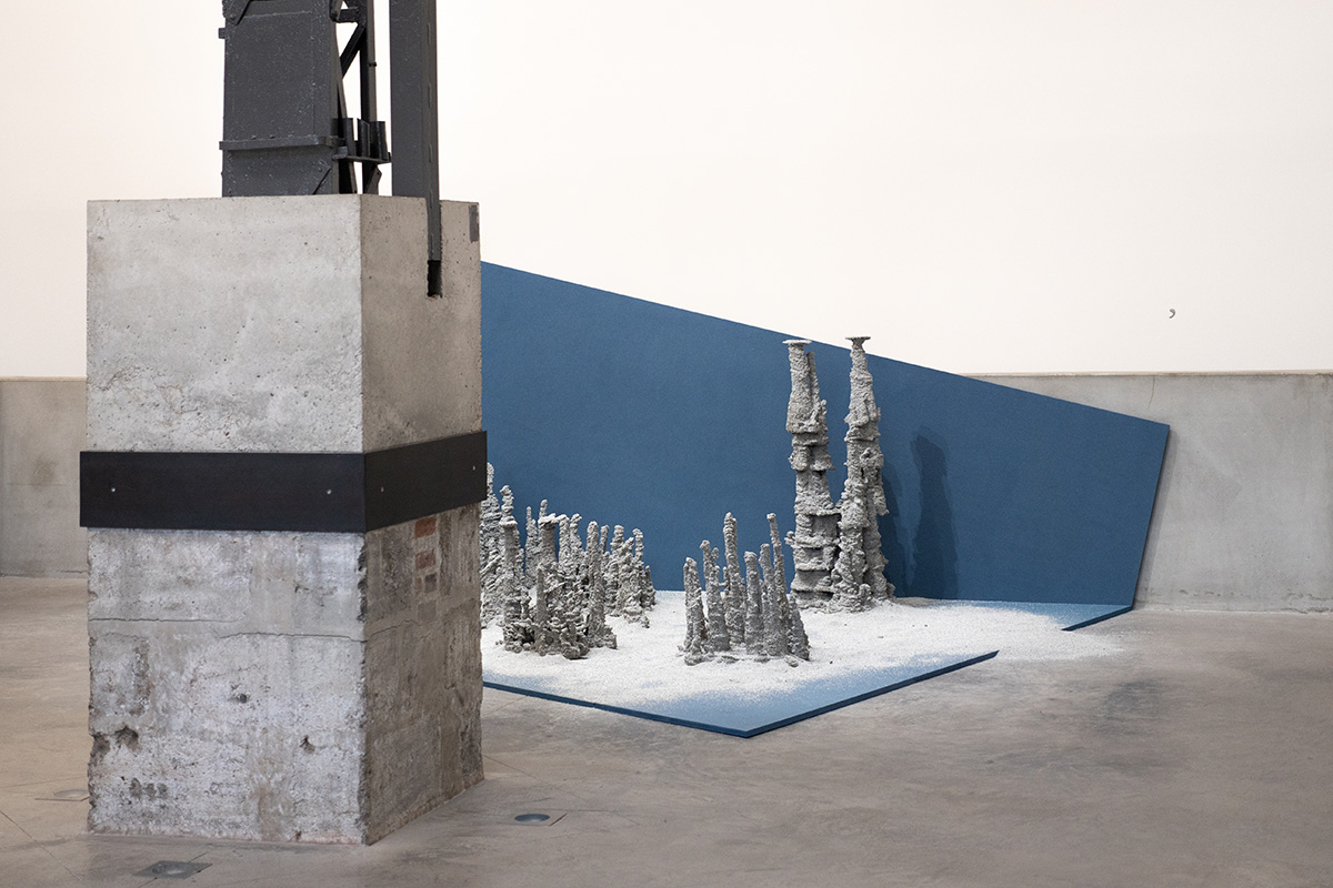 Plaques d’acier brossées et cirées, pierres de sel, cailloux.