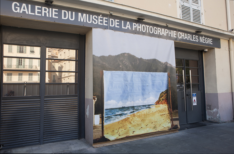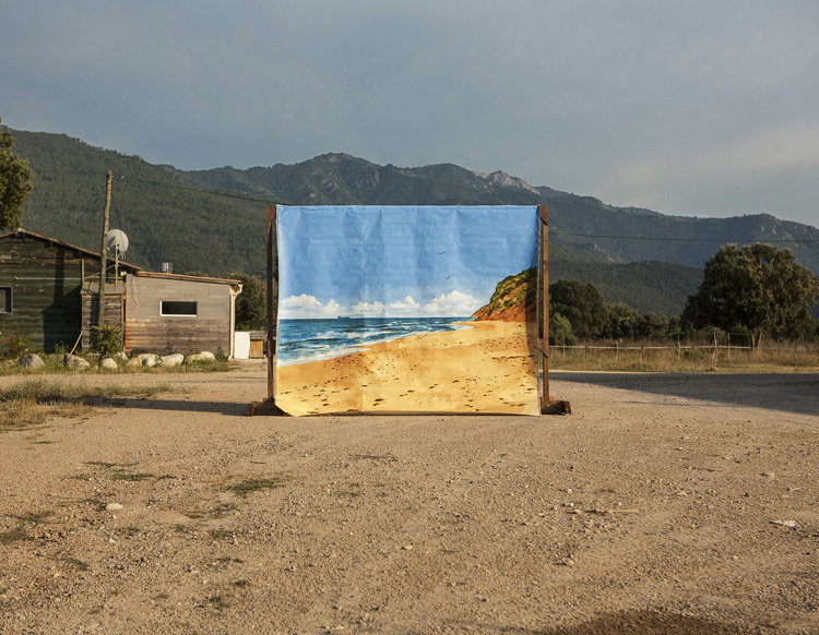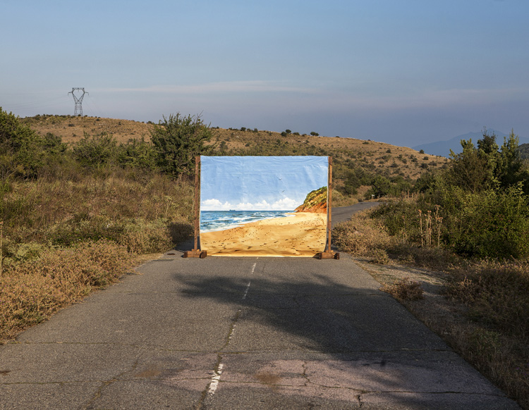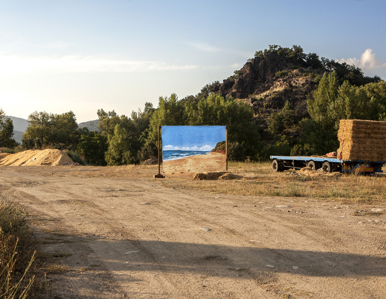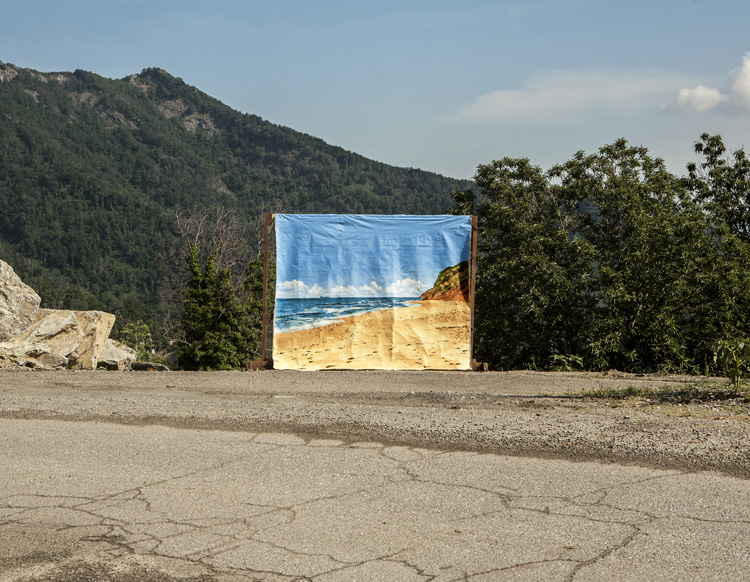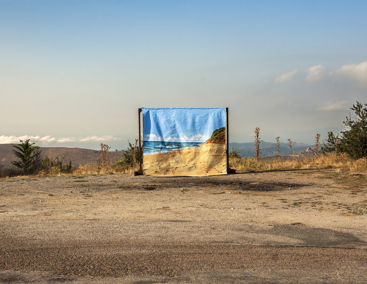 Tout d’abord au travers de la référence au studio photographique itinérant, une pratique qui débuta à la fin du XIXème siècle où des photographes se déplaçaient de villes en villes, de pays en pays, dans les campagnes. S’ils ont aidé à démocratiser la photographie dans des régions qui n’y avaient pas encore accès, ces travailleurs itinérants n’avaient pas bonne réputation. Aujourd’hui avec la crise au Moyen-Orient, l’afflux de migrants dans nos pays mettent en lumière cette autre forme d’itinérance. J’ai donc créé un studio itinérant que je déplace dans un paysage de montagnes. Reprenant les traditions et les habitudes de studios de l’époque, le dispositif se compose d’un fond peint qui représente une plage de la Méditerranée, accroché sur un support en bois.