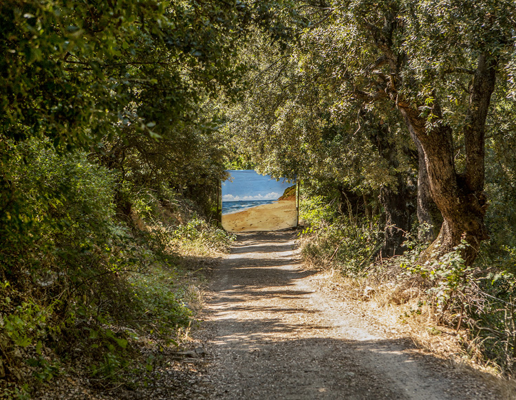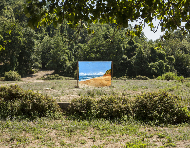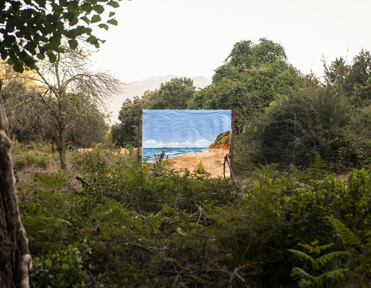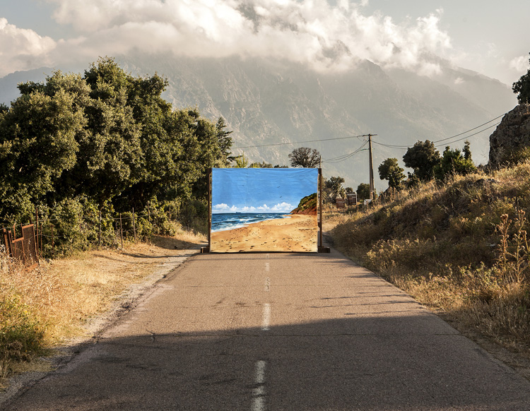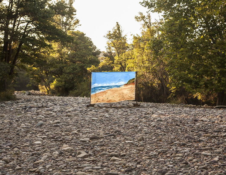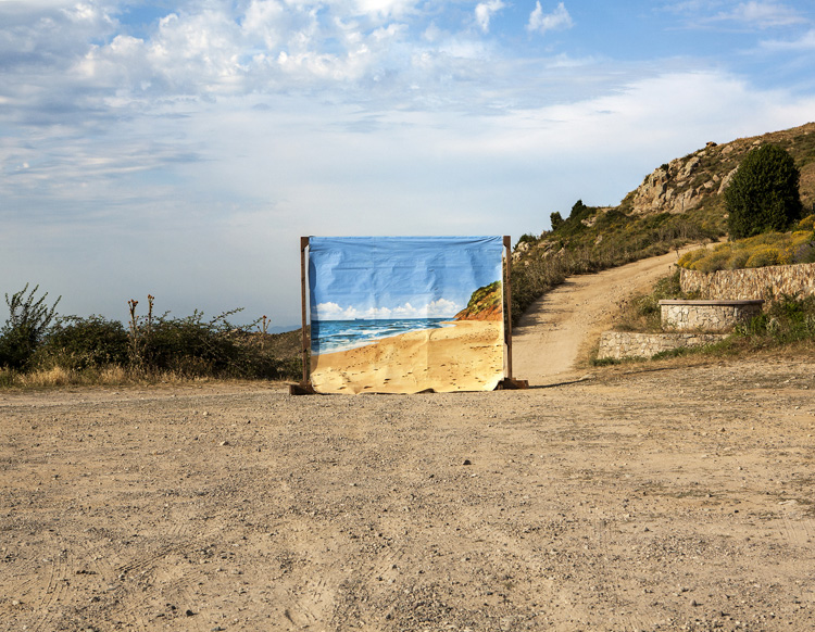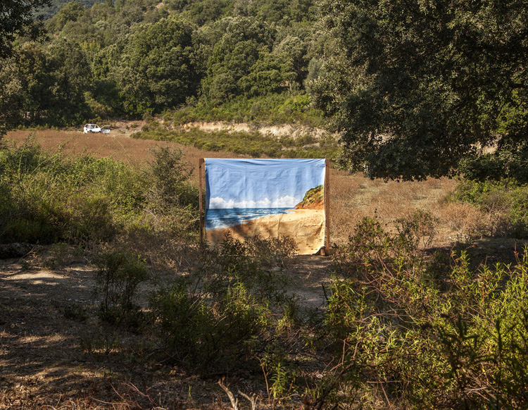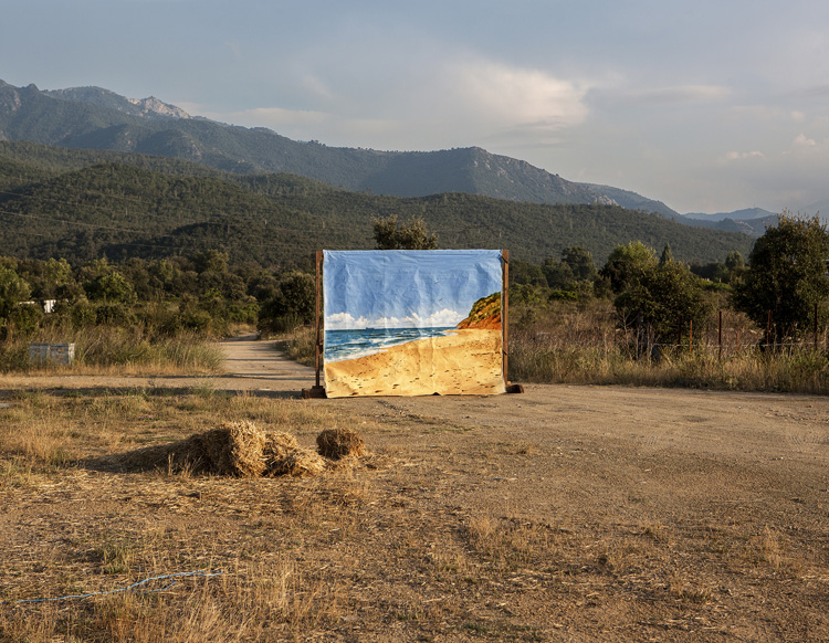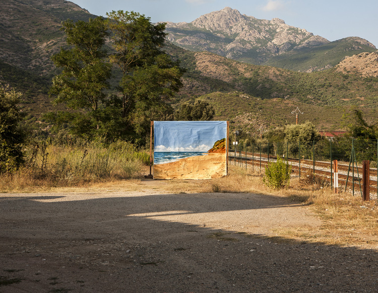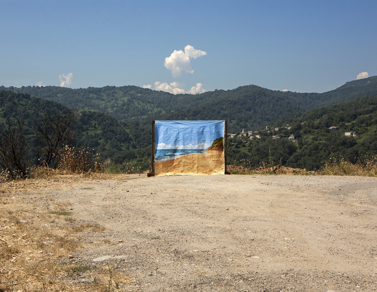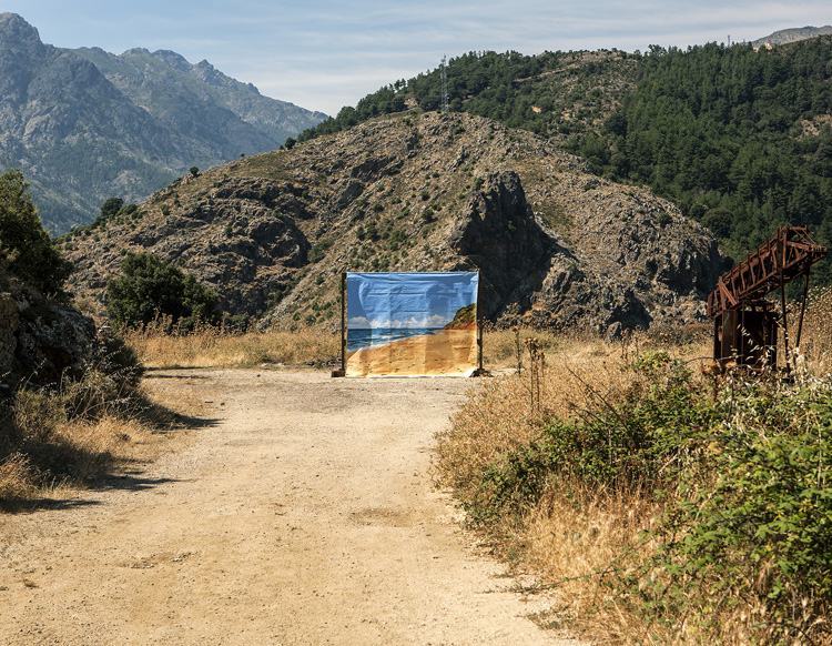 Les montagnes sont pour moi originaire des Alpes Maritimes, symboliques de l’itinérance, les chaînes montagneuses ayant été souvent choisies comme ligne de partage entre deux pays, que ce soit les Alpes avec l’Italie ou les Pyrénées avec l’Espagne. Il faut les traverser pour passer la frontière. Elles sont un terrain de marche et la promesse d’une autre vie, une fois passé de l’autre côté. Le paysage peint de la plage revient au milieu de mon cadre comme un mirage, parfois venant prolonger le paysage réel autour.