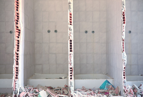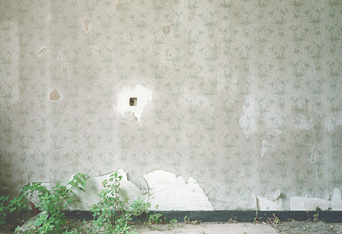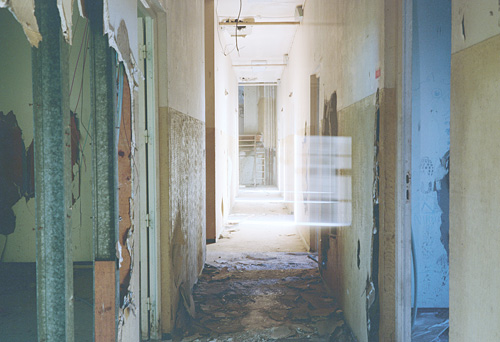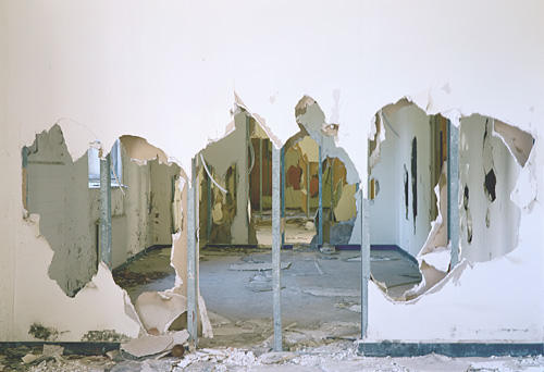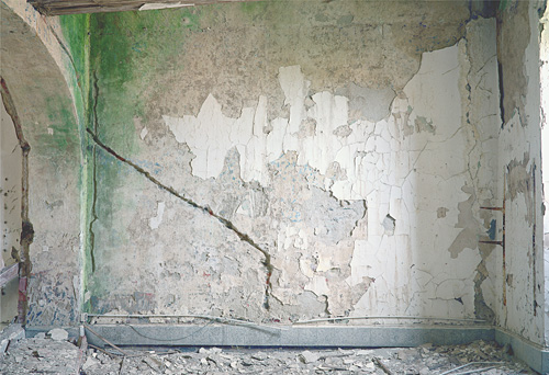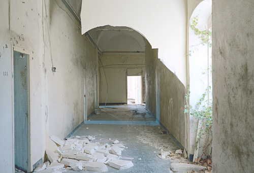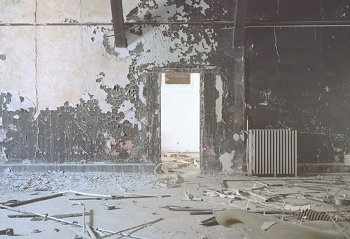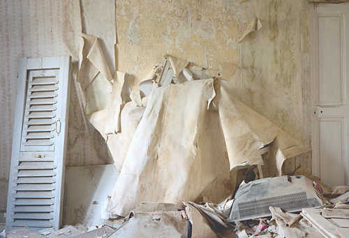 Evidemment, les images qu’il produit en possèdent nombres de caractéristiques et d’attributs. Généralement, ses images sont frontales. Que ce soit la vue d’un lit abandonné, défait par le temps, que ce soit également un couloir envahi de gravats et dont le plafond s’effondre, toutes ces photographies exposent un motif parfaitement cadré. Ce qui est au centre de l’image semble le sujet même de la photographie.