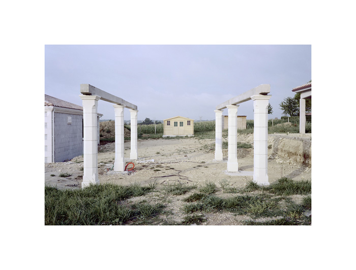 Il se comporte volontiers en ethnologue, mais un ethnologue fasciné par le vernaculaire et la façon dont chacun se réapproprie ou non un langage architectural d’une normalité absolue. Refusant l’instantané, délaissant la fascination pour l’événement, le sujet de ses images est double, voir triple.. En premier lieu, il isole un objet : ici une architecture. Dans un second temps, la banalité du sujet libère tout un répertoire de formes abstraites. Ces formes, véritables sculptures minimales, redoublent l’architecture, lui échappent, la contraignent. Elles l’oblitèrent en somme. Un portique inachevé à force d’être observé devient une structure sans dimension, sans échelle, presque un programme pour artistes en mal d’inspiration. Ici, aucune prise de position, aucune dénonciation virulent. André Mérian n’appartient pas à cette génération d’artistes cyniques, conspuant avec arrogance la bêtise humaine, le kitsch ou la pauvreté esthétique de l’habitat contemporain.