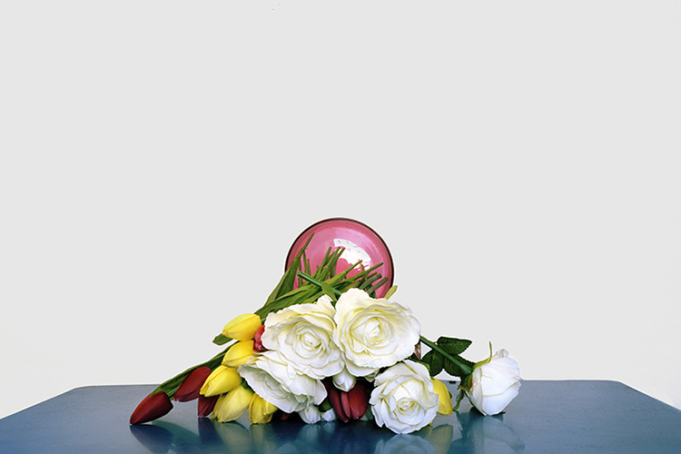 Ensuite, l’élégant charivari du bouquet renversé fait entrer le temps, l’événement, dans l’image : il s’est passé quelque chose, mais quoi ? Un faux mouvement, une colère, une scène de ménage ? Aucune eau pourtant ne se répand sur la table. Serait-ce alors une révérence ? Ce bouquet introductif nous ferait-il une révérence ironique pour nous accueillir au seuil de la série des images ? À moins qu’il ne nous la tire, sa révérence, suggérant ainsi que ces tulipes et ces roses ne peuvent désormais avoir droit de cité artistique que couchées, vaincues, déchues de leur trop classique et arrogante beauté verticale ? Impossible là encore de répondre à ces questions, de même que nous ne saurons pas si ces fleurs sont naturelles ou artificielles. Seule certitude, le temps et un geste radical ont fait leur œuvre.