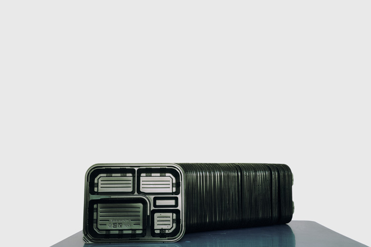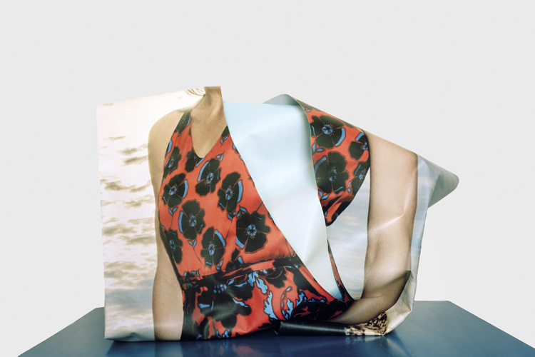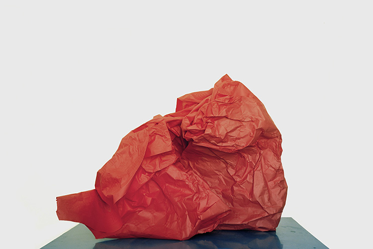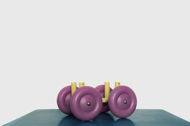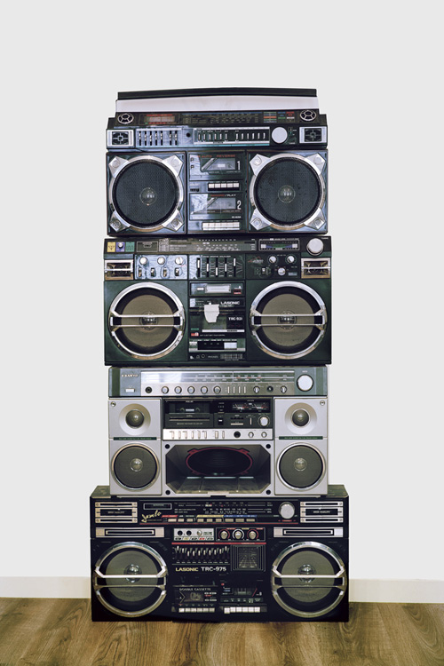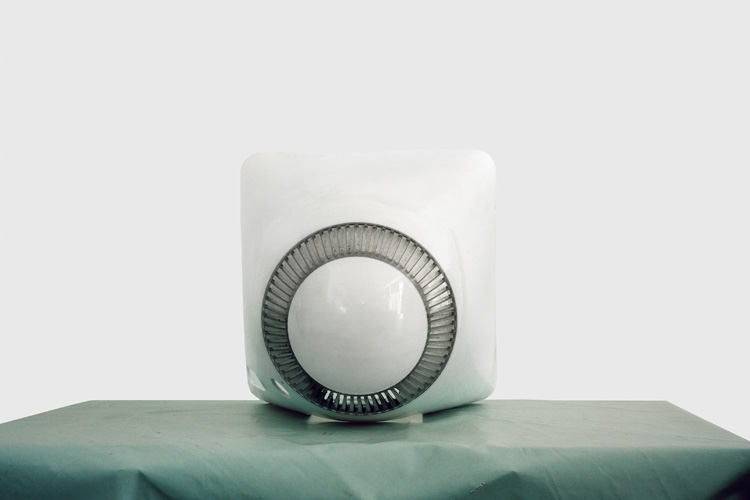 Voilà bien l’une des énigmes de cette série : où, dans quel lieu a-t-elle été réalisée ? S’il utilise un fond blanc uniforme mimant le studio de prises de vues, André Mérian, contrairement à ses glorieux prédécesseurs, varie les surfaces ou la scène où il installe ses objets sculpturaux : c’est en général un plateau sobre et miroitant, mais la place qu’il occupe dans l’image se modifie constamment ; ailleurs, c’est une grande feuille de papier fixée à la va-vite, sans doute dans une autre pièce ou un autre lieu, et puis de gros radios-cassettes sont empilés sur du parquet. Ce n’est pas désinvolture ou négligence de sa part, mais là encore un choix délibéré qui nous écarte du modèle canonique de la photographie conceptuelle.