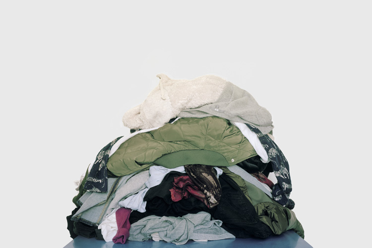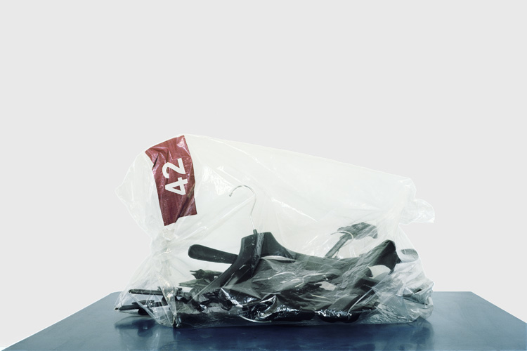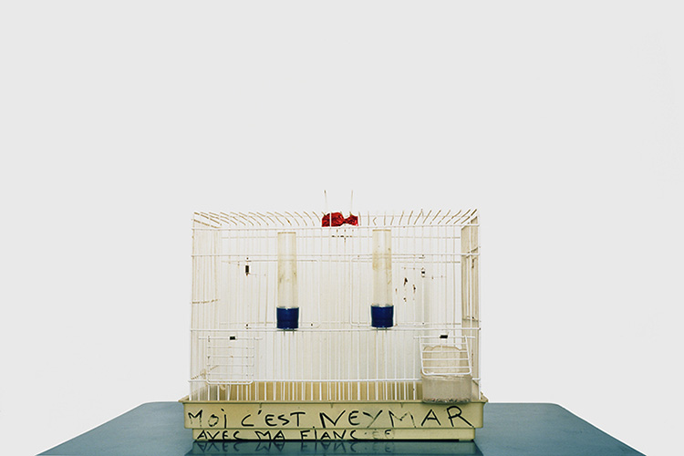 De même, chaque image de la série montre et résulte d’un télescopage de temps, parfois de bribes de fictions : qui a ligoté en fagot ces bouts de lambris, et pour quel usage dérisoire ? Pourquoi l’ours en peluche est-il en partie brûlé ? Où est passé l’habitacle du jouet dont il reste seulement les quatre roues violettes ? Qui a porté ces vêtements avant de s’en débarrasser ? Où sont les bouteilles de vodka Smirnoff dont seul demeure le carton ? Comment le mur de Lego multicolores est-il arrivé sur cette table ? Qui a placé tous ces cintres en plastique noir dans la poche plastique numéro 42, et pourquoi l’avoir jetée ? Quelle marque vantait la bâche publicitaire joliment lacérée montrant une robe d’été aux motifs floraux ? Et puis, qui a écrit ces mots sur la cage à oiseaux vide, « Moi c’est Neymar avec ma fiancée » ?