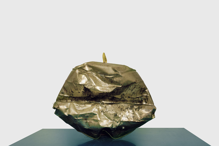 Même perplexité face à une boîte en carton beige posée sur un sol ou une table. J’y ai d’abord vu un empilement de cartons de pizzas, puis, réflexion faite, un emballage de matériel high-tech. Et puis que contient le sac Ikea bleu ? Les reflets sur la surface convexe, la rotondité de l’objet, l’évasement du sac m’ont fait penser à un ballon de baudruche. C’est un abattant de W.C. Plus loin, la toupie dorée et cabossée, surmontée d’une petite tige comme une pomme de sa queue, n’en est pas une, mais un bidon d’essence.