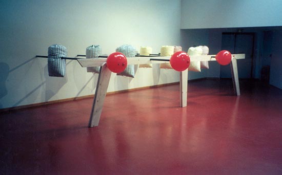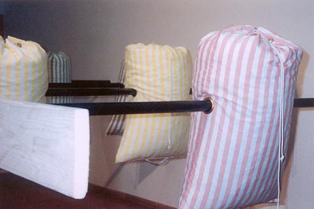 Sacs de lingerie d'hôpital, bouées, tubes métalliques, bois, éléments de calage en polystyrène