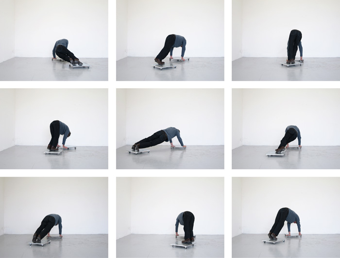 Le performer se déplace sur deux socles à roulettes munient de capteurs qui sont connectés à un ordinateur, ses mouvements changent la durée, la vitesse, la tonalité d’une matière sonore.