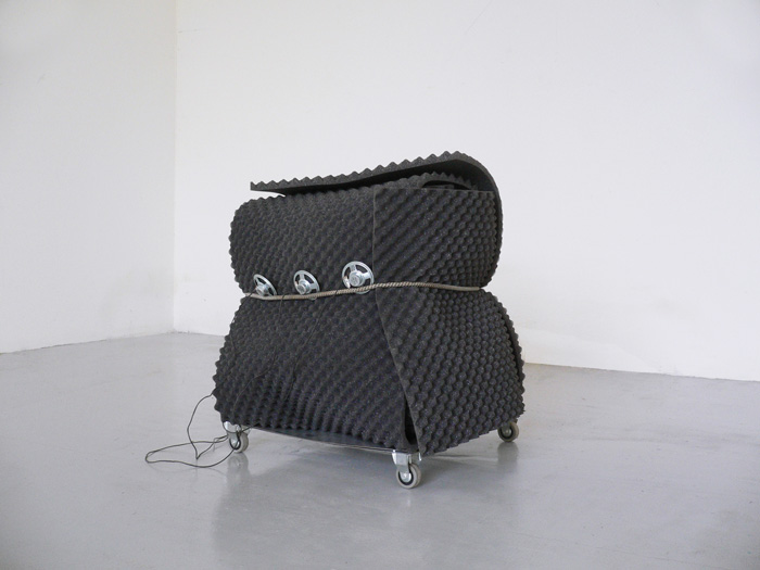 Tapis mousse, câbles, ampli, lecteur, haut-parleurs, socle à roulette