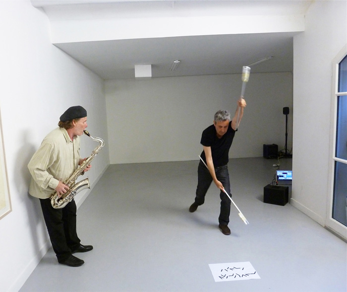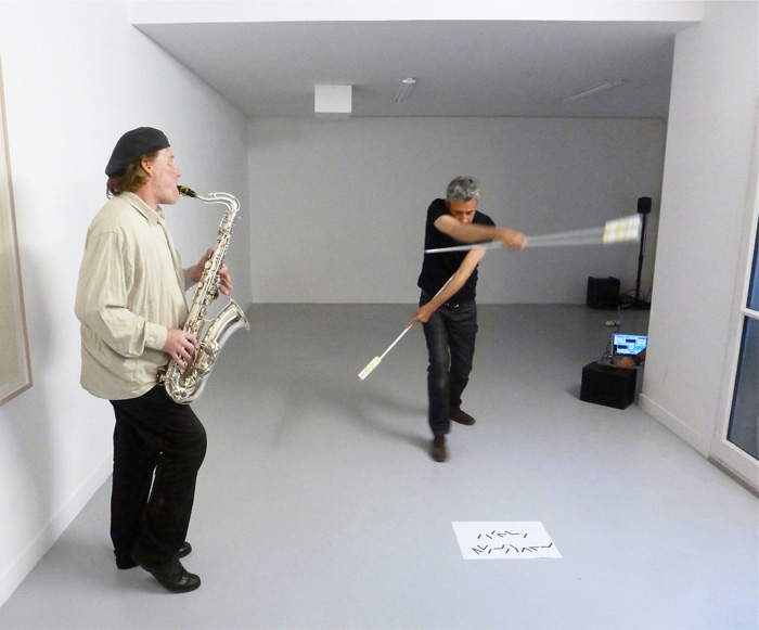 Le performeur munie de capteurs reliés à un programme informatique joue la partition au sol, elle est écrite avec l'alphabet sémaphore, un saxophoniste vient répondre avec des sons à ces propositions sonores qui s’accélèrent et se transforment par les gestes du performeur qui deviennent de moins en moins précis. |