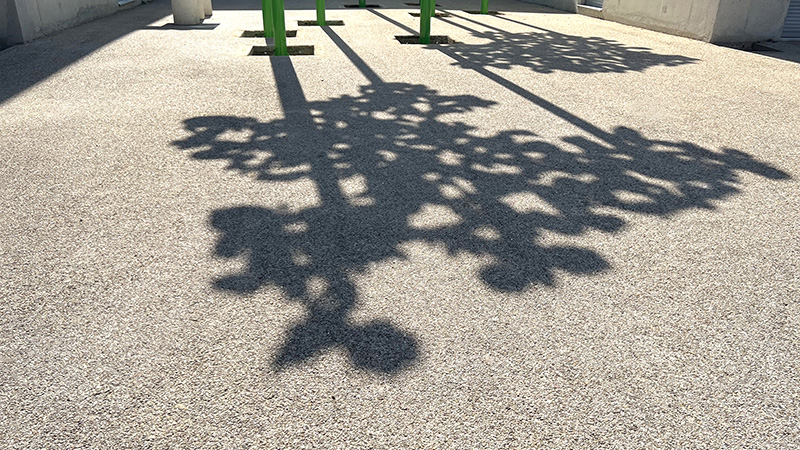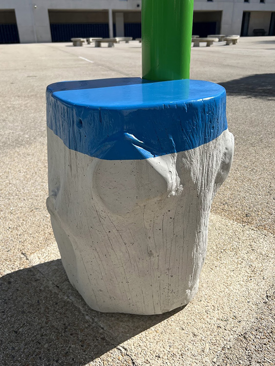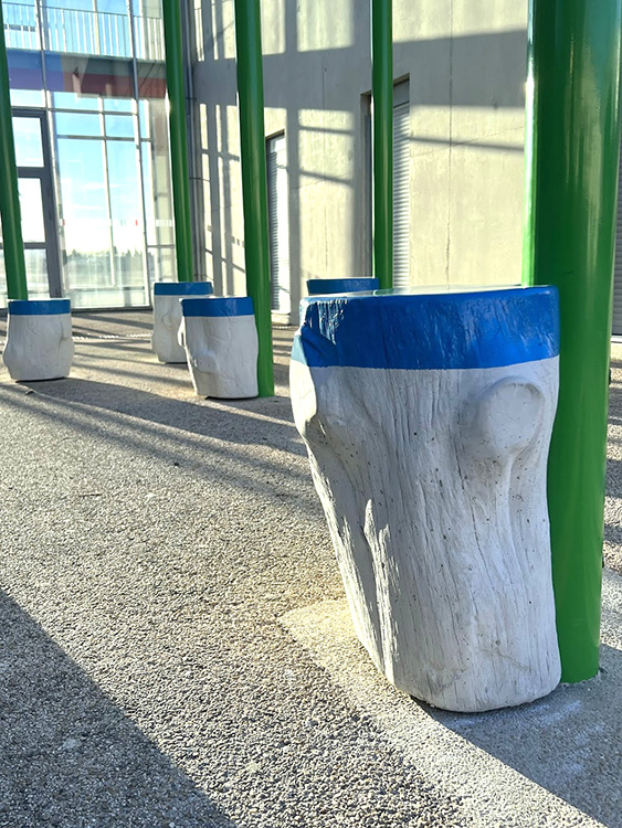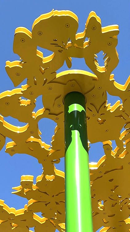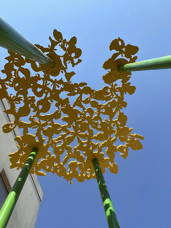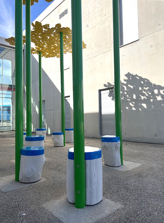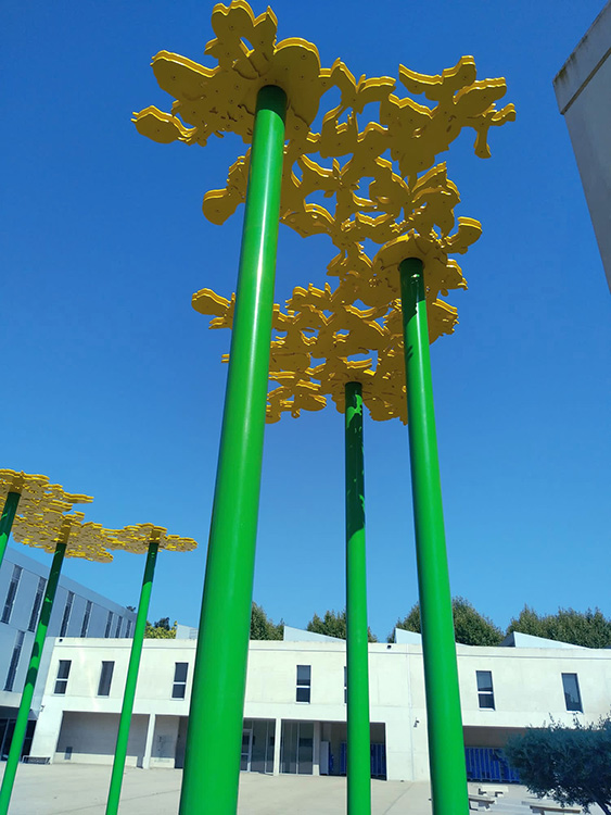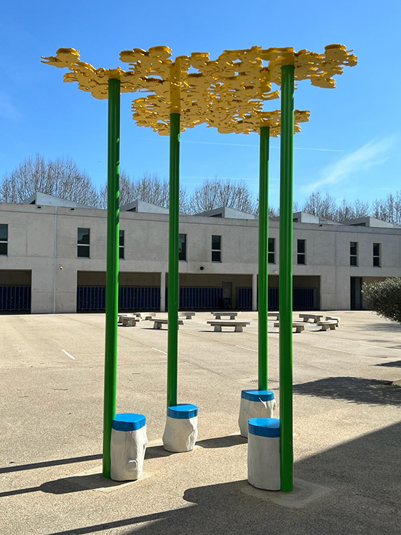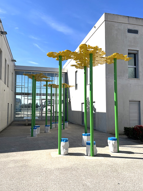 La gamme chromatique de l'installation se compose de trois teintes : le jaune pour les dentelles de fleurs de Glais, le vert pour les poteaux et le bleu pour les sièges. Ces trois couleurs sont initialement présentes dans l'architecture intérieure du collège sous forme de rubans peints qui se déploient dans les espaces de circulation. Enfin, les percées créées par ces dentelles, permettent à la lumière solaire, en fonction de son inclinaison, de dessiner des formes au sol et sur les murs des façades Sud et Nord des deux patios. Ces formes, en constantes variations d'échelle et d'intensité, fonctionnent comme des paréidolies permettant à l'esprit de divaguer. Elles viennent brouiller la rigueur des lignes architecturales du bâtiment pour mieux les souligner. Cette oeuvre a été réalisée et installée par l'Atelier Ni.
