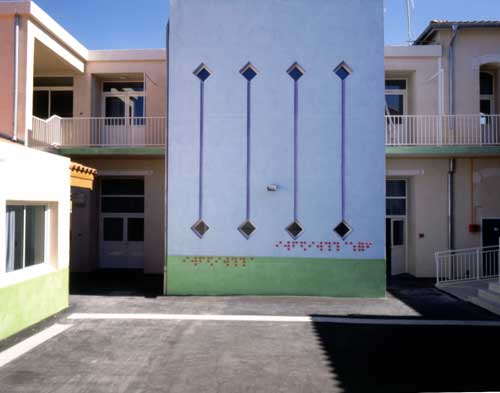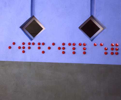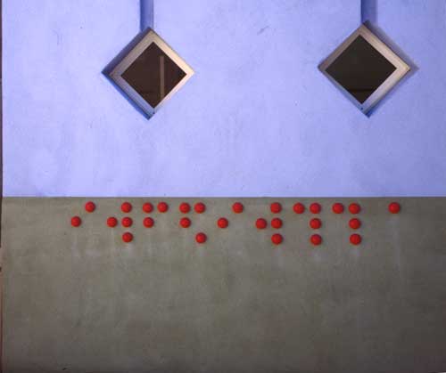 Les deux mots s'inscrivent sur la façade côté cour du bloc sanitaire. Leur mise en espace sera faite sur deux lignes. Chacune de ces lignes comportera trois rangées de demi-boules, car l'écriture braille est fondée sur un système de six points sur deux colonnes. Le mot désapprendre viendra s'inscrire à une hauteur de 70 cm sur la partie peinte en vert sur le côté droit du mur. Le mot apprendre s'inscrira à une hauteur de 120 cm sur la partie peinte en bleu clair sur le côté gauche du mur. Cette pièce est très ludique et attire le toucher. La superposition des demi-boules rouges sur les fonds bleu clair et vert pomme transforme cette écriture en une image plastique et gaie. La matière utilisée, le caoutchouc, est souple et dure en même temps. La forme, demi-boules, s'adapte bien au creux de la main. Les deux bourrelets sont là pour retenir cette main invitant le doigt à jouer avec. Après le premier contact visuel s'établit un contact tactile.